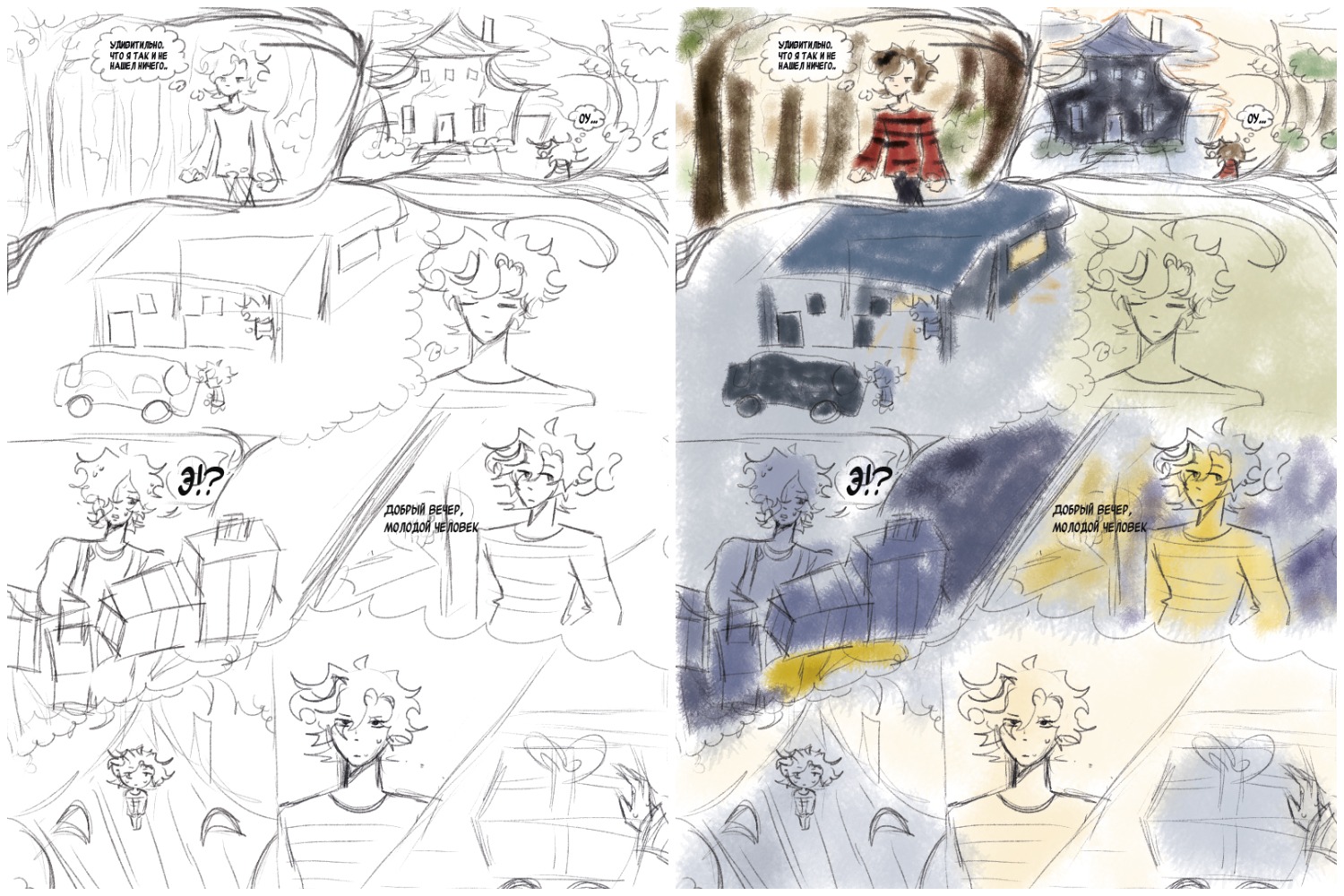 «На одной странице комикса рассказать целую историю бывает тяжело, но вы, Лиза, справились. У вас хорошая рука, получилось передать эмоции и антагонизм героев, соответствующая стилистика. Могу посоветовать использовать технику ближе-дальше, чтобы комикс не состоял только из близких друг к другу масштабов, — так живее смотрится каждый момент. Не обкрадывайте сами себя, используйте эффект движения камеры, часто на лице может быть выражено больше, чем на общем плане с множеством деталей. Также мне нравится, что вы выбрали сдержанную цветовую палитру», — порекомендовал арт-директор.